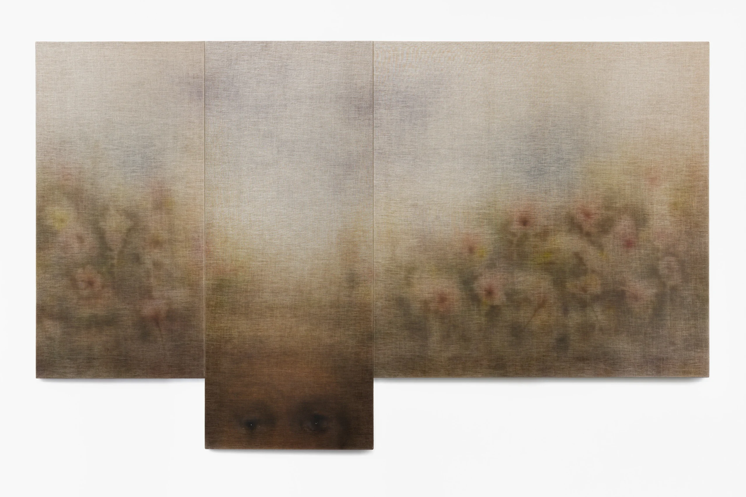 Jędrzej Bieńko, Meadow, 2025, acrylic on canvas, triptych, overall dimensions: 170 × 280 cm, left panel: 140 × 70 cm, middle panel: 170 × 70 cm, right panel: 140 × 140 cm