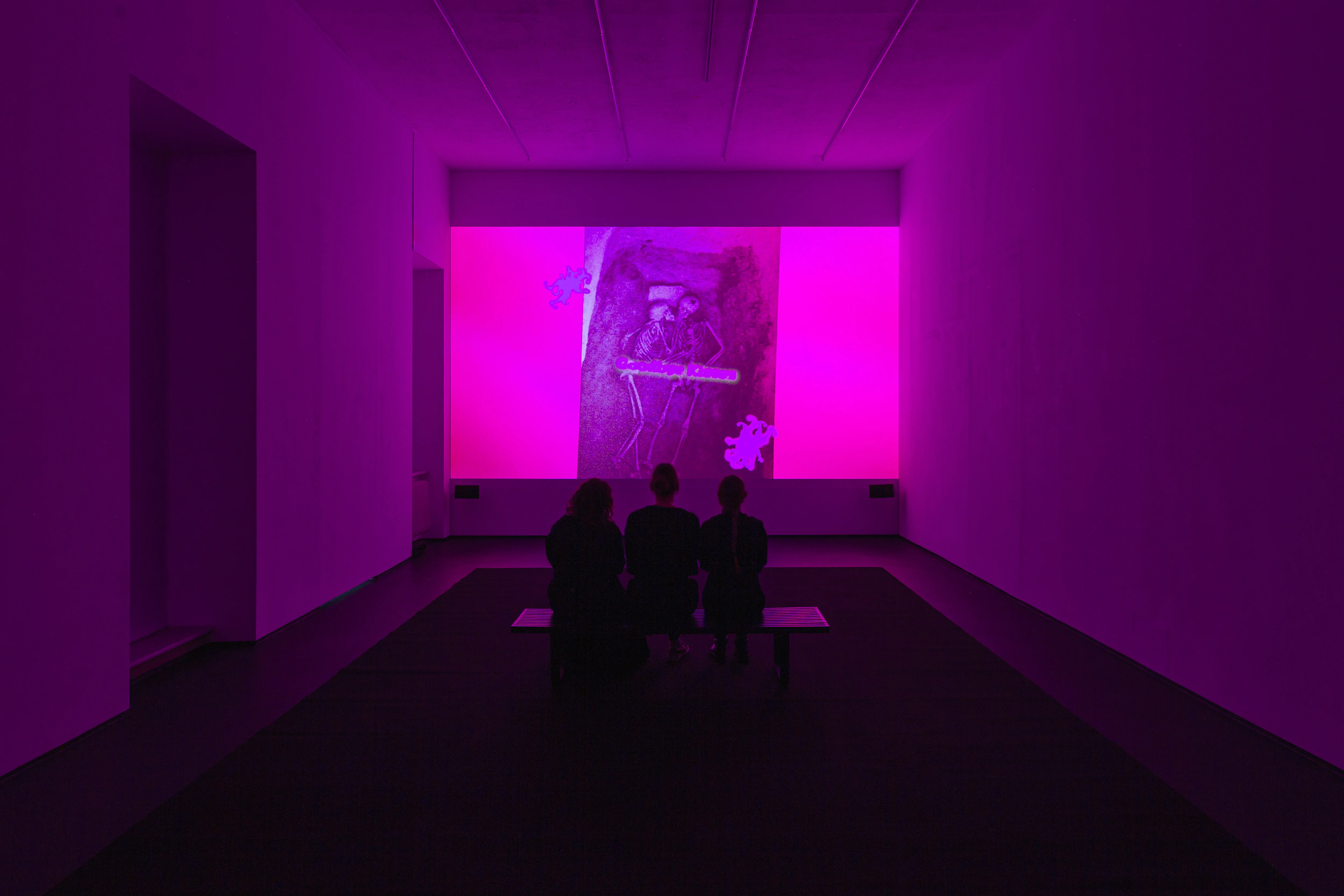Museum artifacts animate against a synthetic pink ground, accompanied by fragments of text that oscillate between instruction and reverie. Objects tied to wartime preservation strategies intersect with personal memory, including an imagined encounter with the artist’s deceased father. Time folds: past, present, and future coexist as overlapping intensities rather than sequence. The unborn child appears as a speculative horizon, suggesting renewal within historical rupture. Wahid reframes artifacts not as static relics but as active carriers of affect and politics, briefly released from colonial narratives into a charged, unstable present.