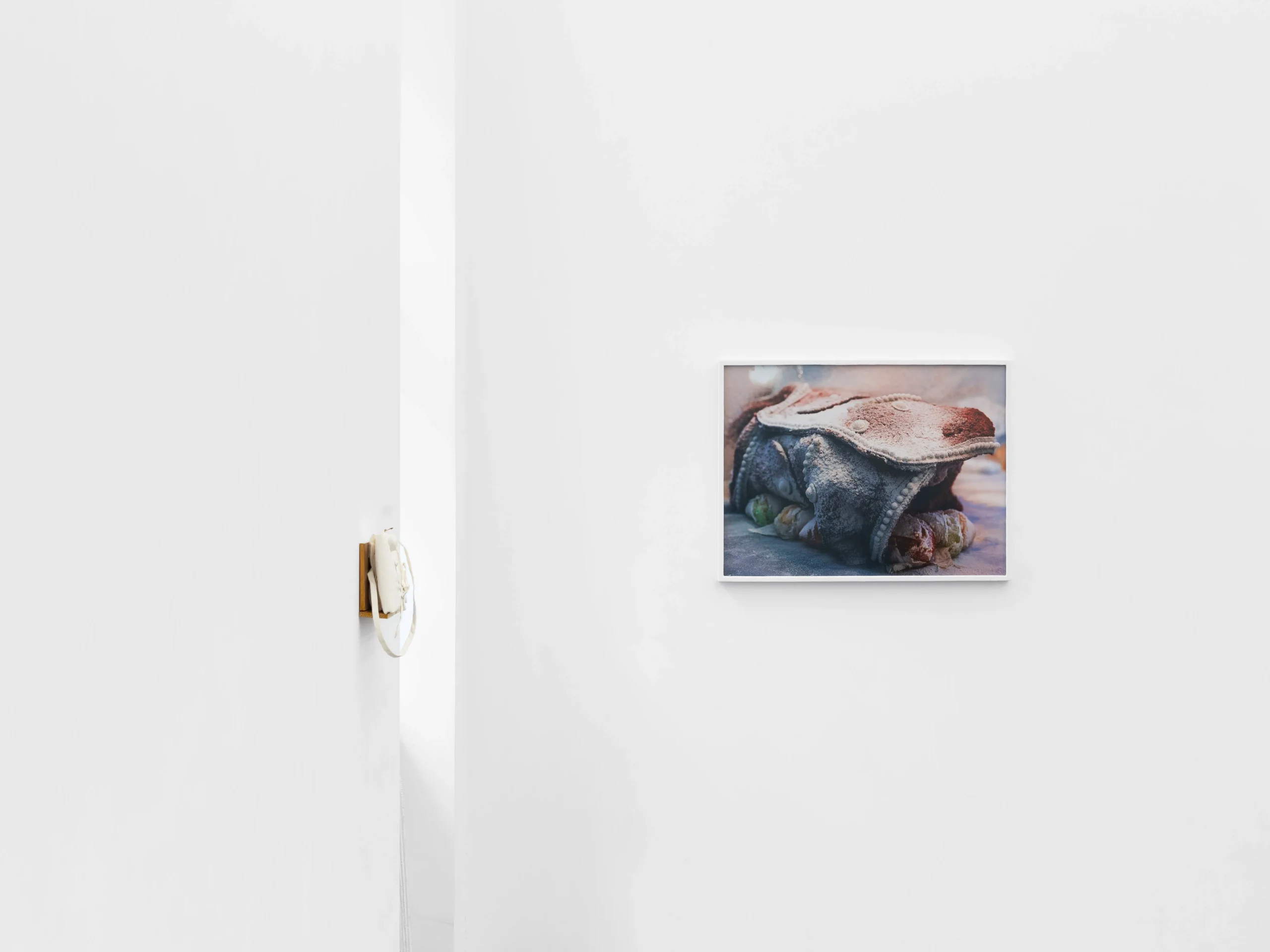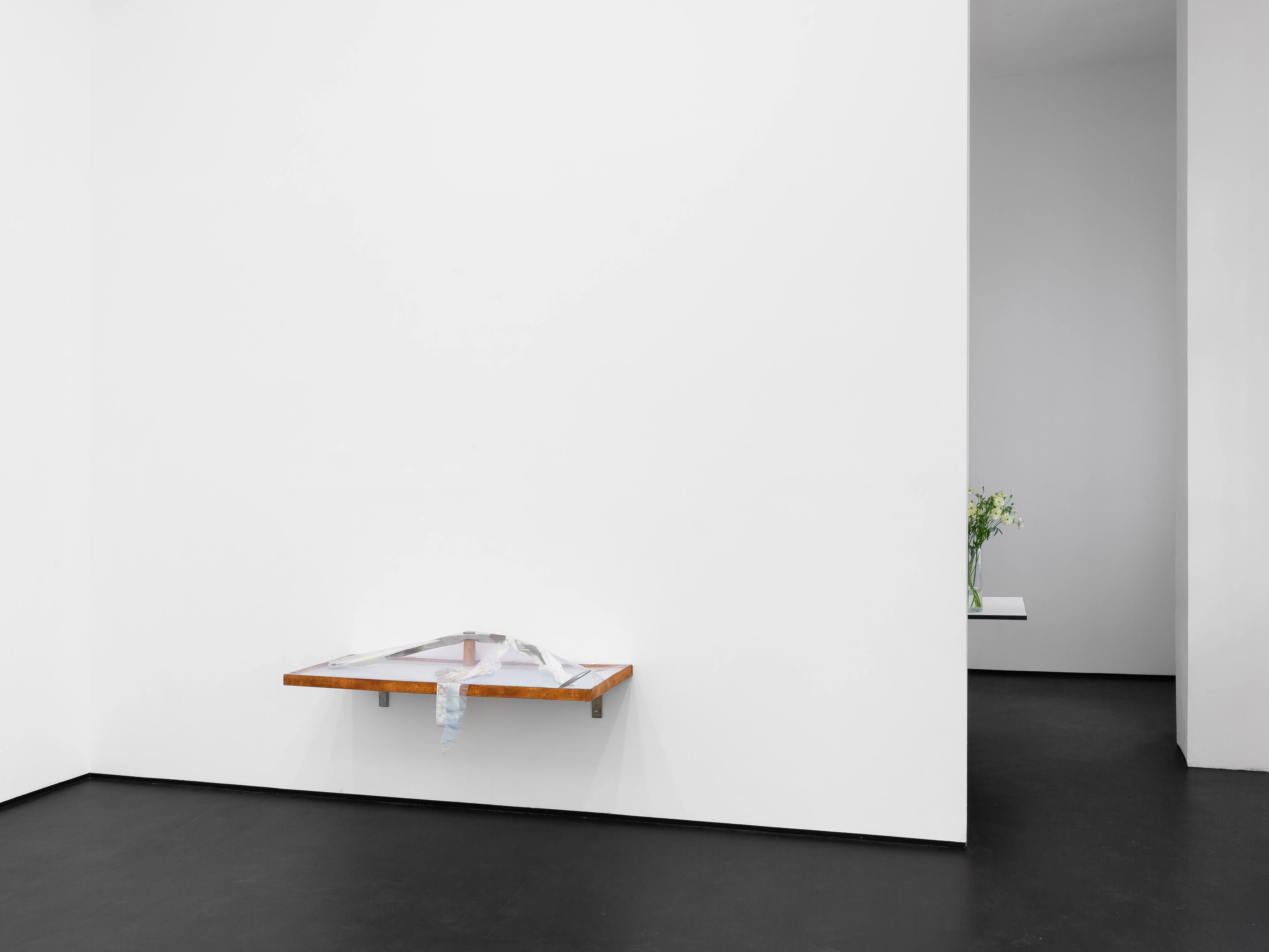 These forms reflect on labor and the handmade, exposing a tension between intimate space and public display, between solids and voids, a logic that extends to I started living in a shoebox recently (2026), a fabric bundle hung on the wall, and let’s go over the bonus situation (2025), a wooden shelf that contains composite, fragile materials.